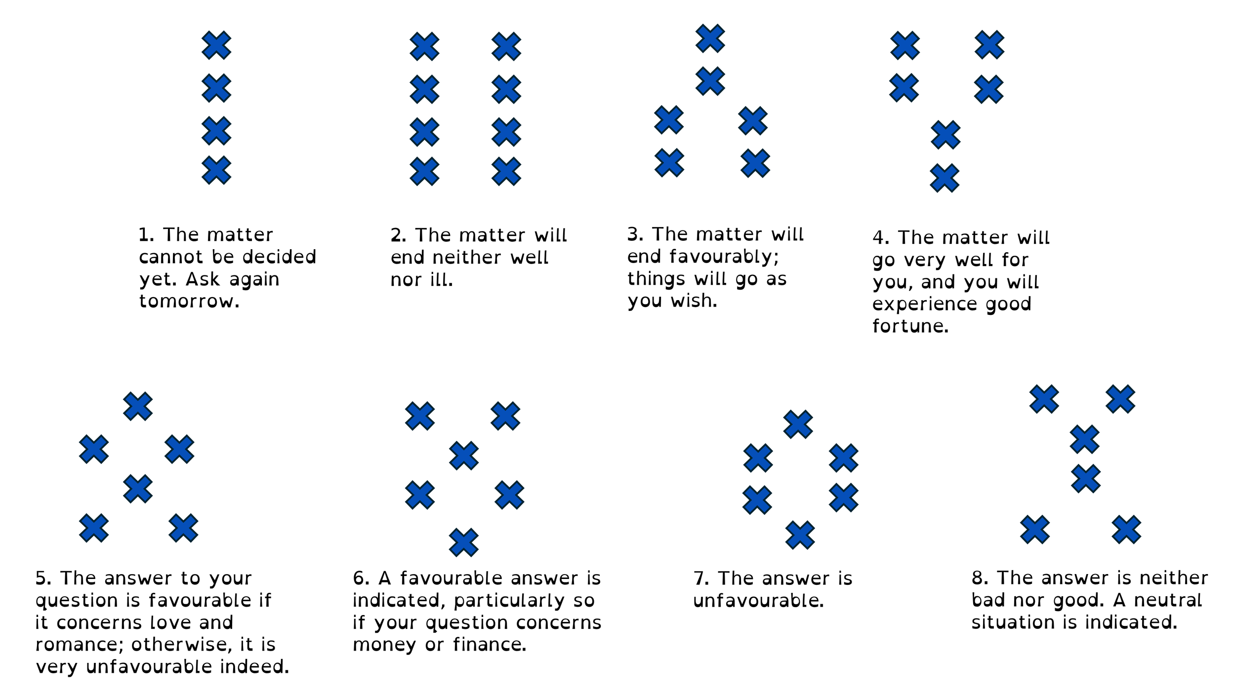 Geomancy chart. For the example in the steps above, the diagram matches number 7: “The answer is unfavourable”